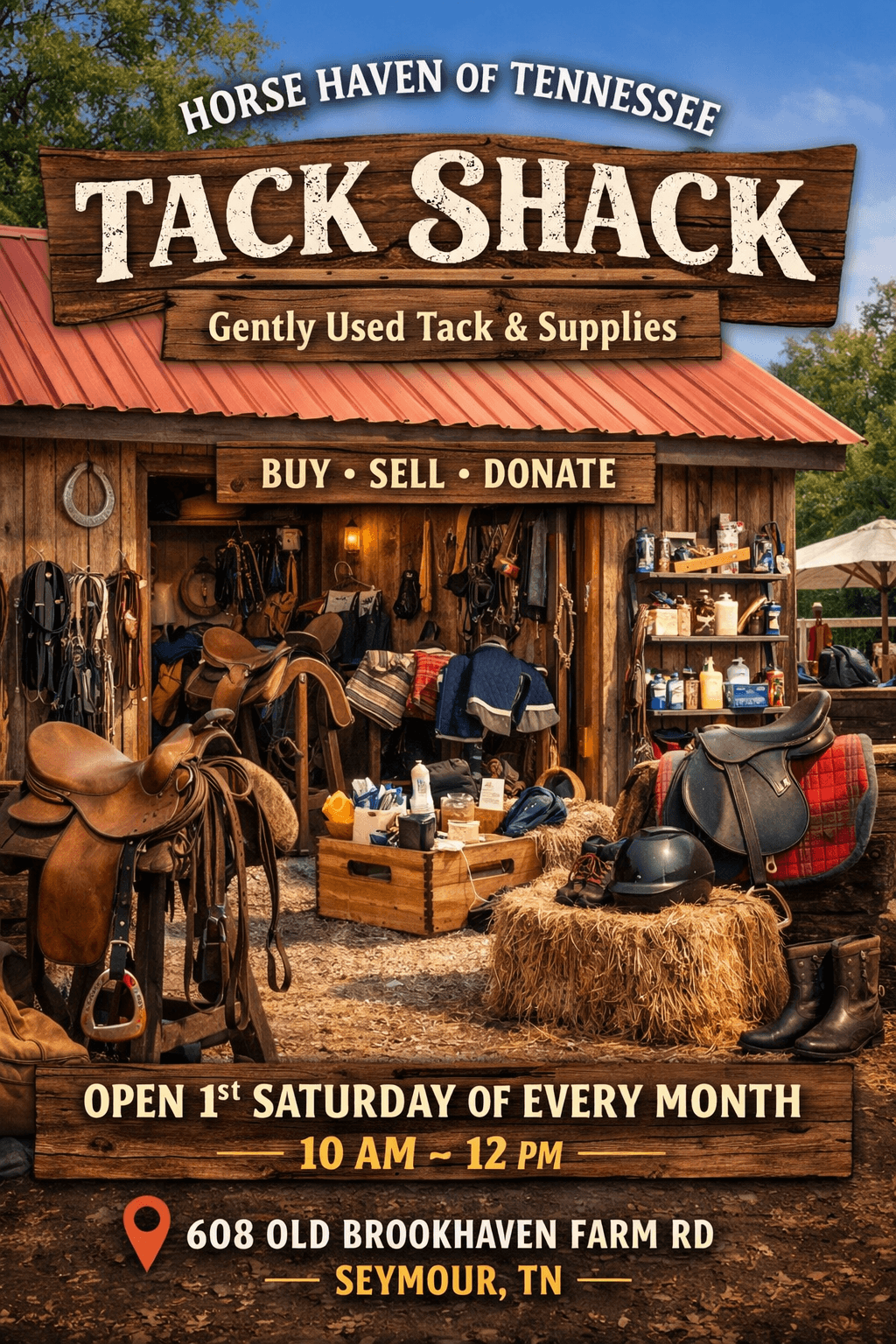 Looking for affordable tack while supporting a great cause? Come shop Horse Haven of Tennessee’s Tack Shack—our gently used tack and supplies store where every purchase helps horses in need.